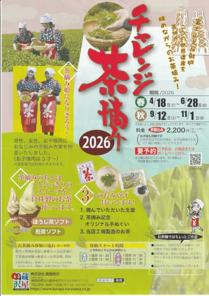 Guests visiting the Izu Peninsula can now enjoy a hands-on tea-picking experience at Hansharo (Nirayama Reverberatory Furnace area). You can even choose to dress in traditional tea-picking attire. You’ll step into the fields and harvest fresh tea leaves just as it has been done for generations.